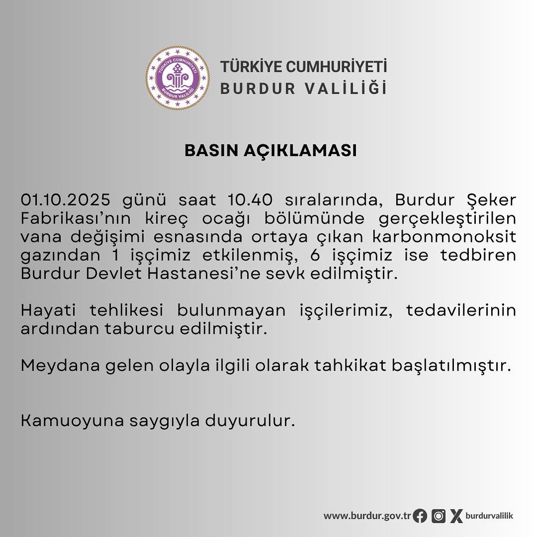 "01.10.2025 günü saat 10.40 sıralarında, Burdur Şeker Fabrikası’nın kireç ocağı bölümünde vana değişimi esnasında ortaya çıkan karbonmonoksit gazıdan 1 işçi etkilenmiş, 6 işçimiz ise tedbiren Burdur Devlet Hastanesine kaldırılmıştır. Hayati tehlikesi bulunmayan işçilerimiz, tedavilerinin ardından taburcu edilmiştir. Meydana gelen olayla ilgili tahkikat başlatılmıştır."
