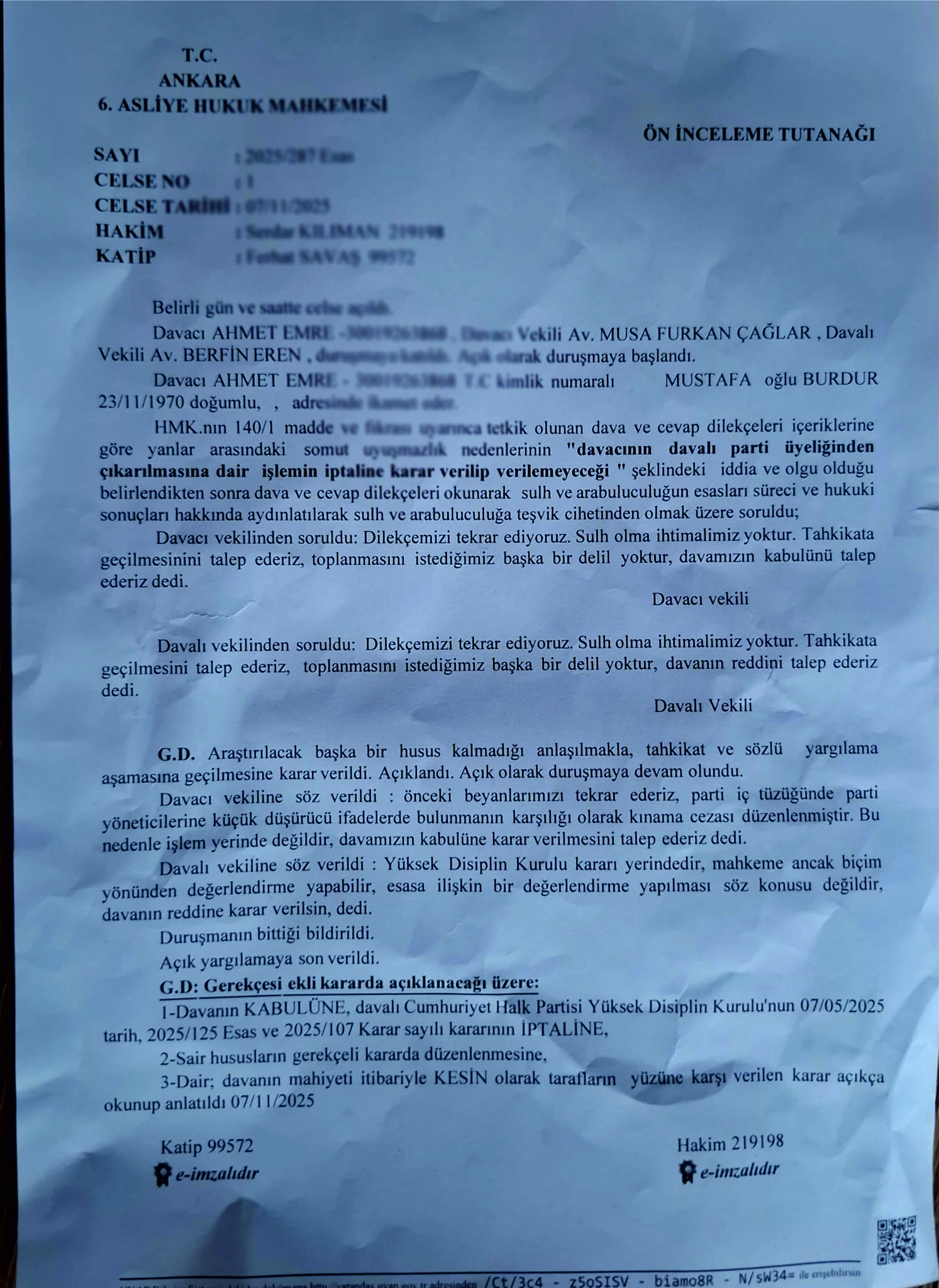 07 Kasım 2025 tarihinde görülen duruşmada, mahkeme davayı “kabul” ederek Ahmet Emre’nin parti üyeliğinin yeniden geçerli hale gelmesine karar verdi. Davayı Emre’nin avukatı Musa Furkan Çağlar yürüttü.